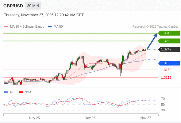 在 1.3180 之上,看涨,目标价位为 1.3280 ,然后为 1.3315 。