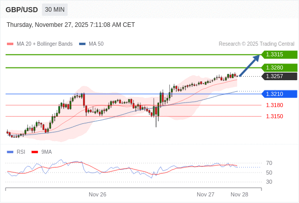 在 1.3210 之上,看涨,目标价位为 1.3280 ,然后为 1.3315 。