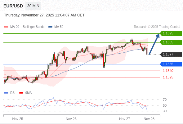 在 1.1555 之上,看涨,目标价位为 1.1605 ,然后为 1.1625 。