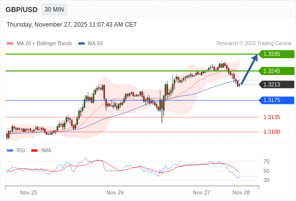 在 1.3175 之上,看涨,目标价位为 1.3245 ,然后为 1.3285 。