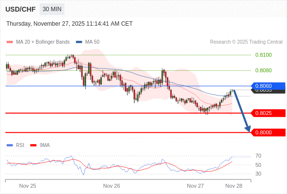 在 0.8060 之下,看跌,目标价位为 0.8025 ,然后为 0.8000 。