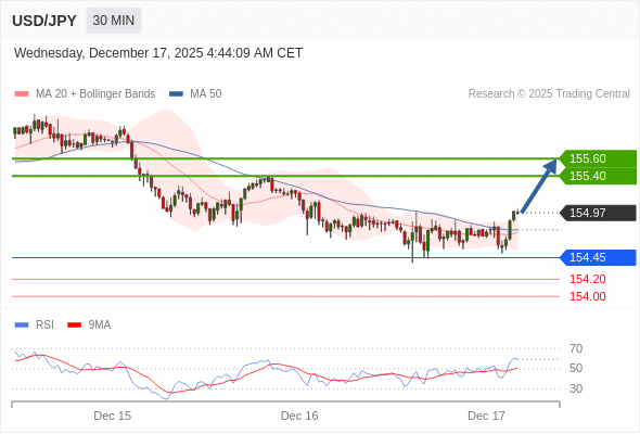 在 154.45 之上,看涨,目标价位为 155.40 ,然后为 155.60 。
