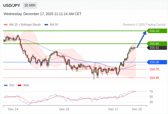 在 154.75 之上,看涨,目标价位为 155.65 ,然后为 156.10 。