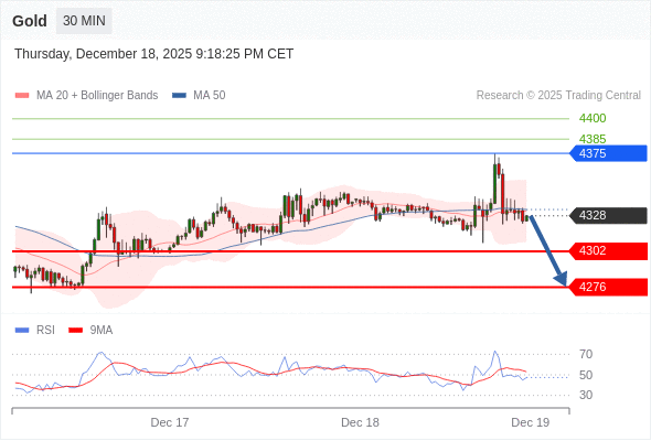 在 4375 之下,看跌,目标价位为 4302 ,然后为 4276 。