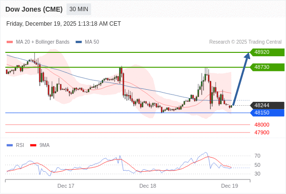 在 48150 之上,看涨,目标价位为 48730 ,然后为 48920 。