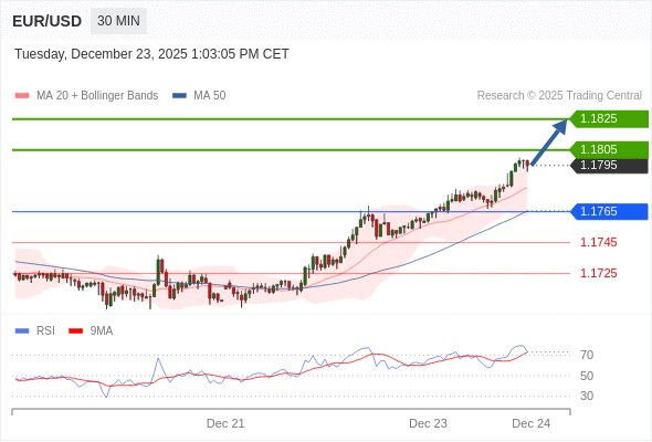 在 1.1765 之上,看涨,目标价位为 1.1805 ,然后为 1.1825 。