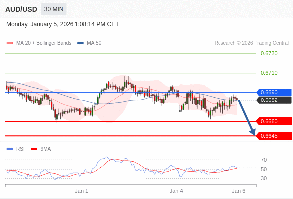 在 0.6690 之下,看跌,目标价位为 0.6660 ,然后为 0.6645 。