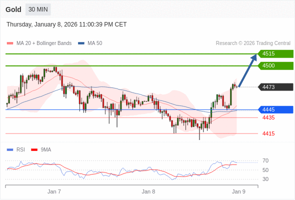 交易策略: 在 4445 之上,看涨,目标价位为 4500 ,然后为 4515 。