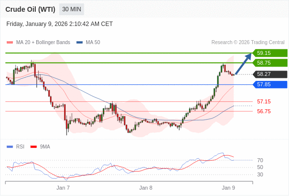 在 57.85 之上,看涨,目标价位为 58.75 ,然后为 59.15 。