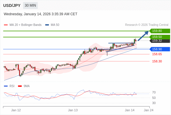 在 158.90 之上,看涨,目标价位为 159.50 ,然后为 159.80 。