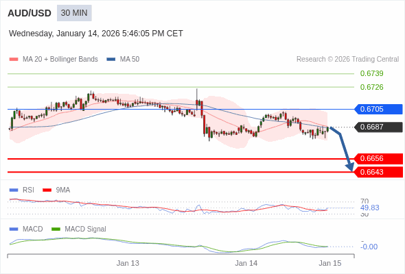 澳元/美元 当日内 : 当 0.6705 维持阻力位时,看跌,目标锁定在 0.6643 。