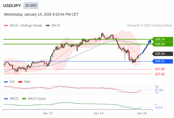 美元/日元 当日内 : 有上涨的可能,目标价位定在 159.14 。