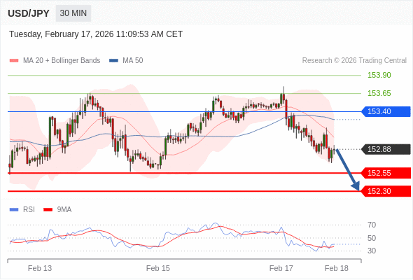 在 153.40 之下,看跌,目标价位为 152.55 ,然后为 152.30 。