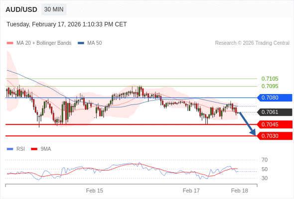 在 0.7080 之下,看跌,目标价位为 0.7045 ,然后为 0.7030 。