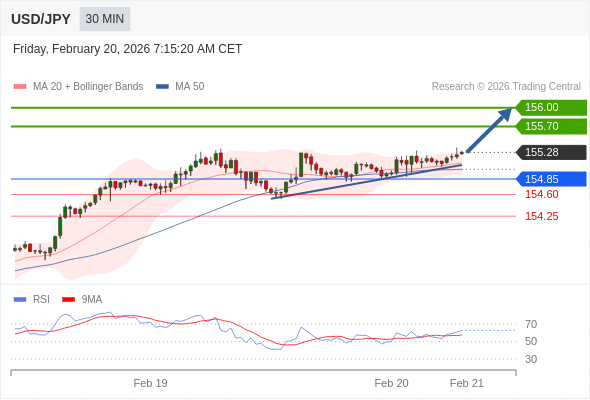 在 154.85 之上,看涨,目标价位为 155.70 ,然后为 156.00 。