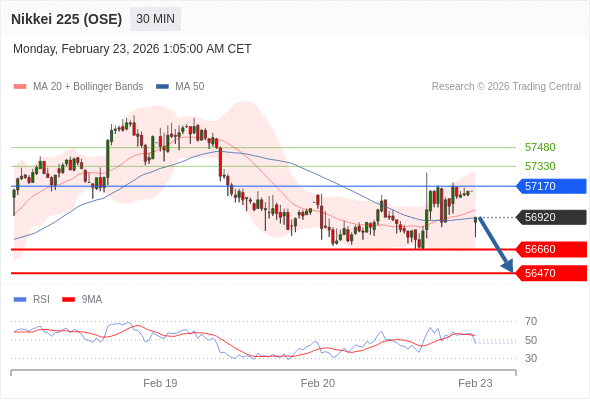 在 57170 之下,看跌,目标价位为 56660 ,然后为 56470 。