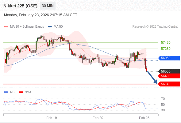 在 56980 之下,看跌,目标价位为 56400 ,然后为 56140 。