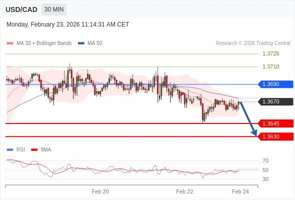 在 1.3690 之下,看跌,目标价位为 1.3645 ,然后为 1.3630 。