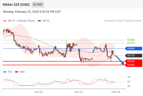 在 56980 之下,看跌,目标价位为 56530 ,然后为 56400 。