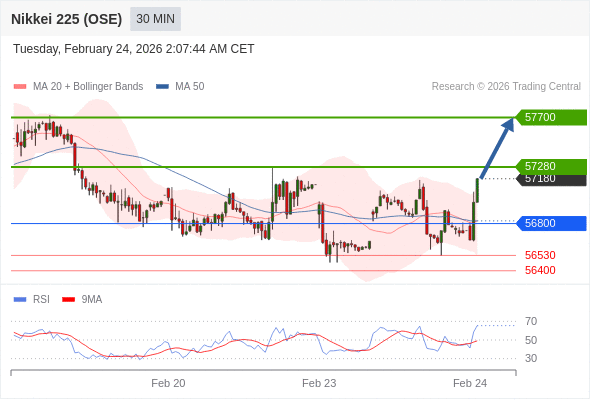 在 56800 之上,看涨,目标价位为 57280 ,然后为 57700 。