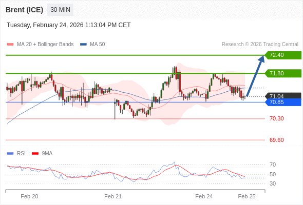 在 70.85 之上,看涨,目标价位为 72.05 ,然后为 72.50 。