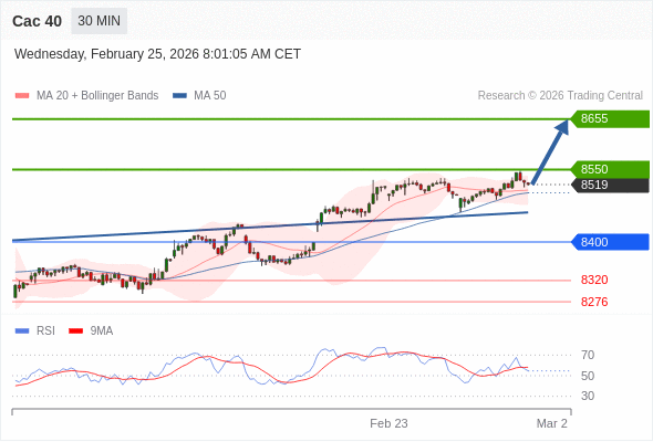 Cac 40 当日内: 在8400之上,看涨。