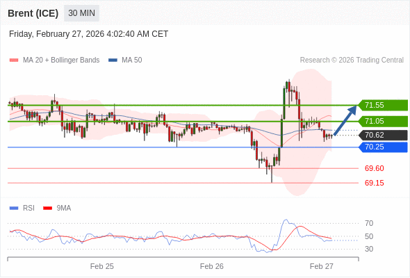 在 70.25 之上,看涨,目标价位为 71.05 ,然后为 71.55 。