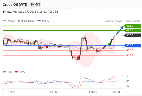 在 65.65 之上,看涨,目标价位为 67.30 ,然后为 67.80 。