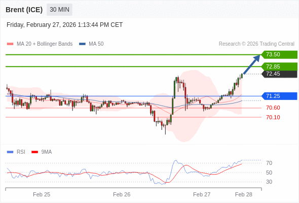 在 71.25 之上,看涨,目标价位为 72.85 ,然后为 73.50 。