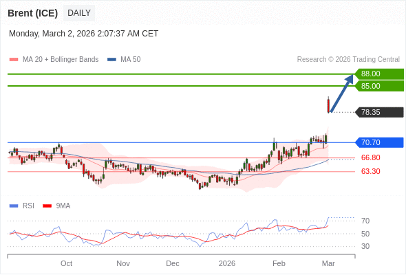 在 70.70 之上,看涨,目标价位为 85.00 ,然后为 88.00 。
