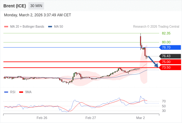 交易策略: 在 78.70 之下,看跌,目标价位为 75.00 ,然后为 73.50 。