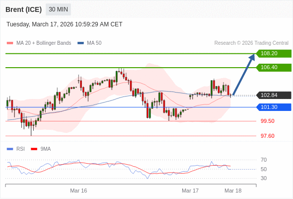 布伦特原油 (ICE) (K6) 当日内: 在101.30之上,看涨。