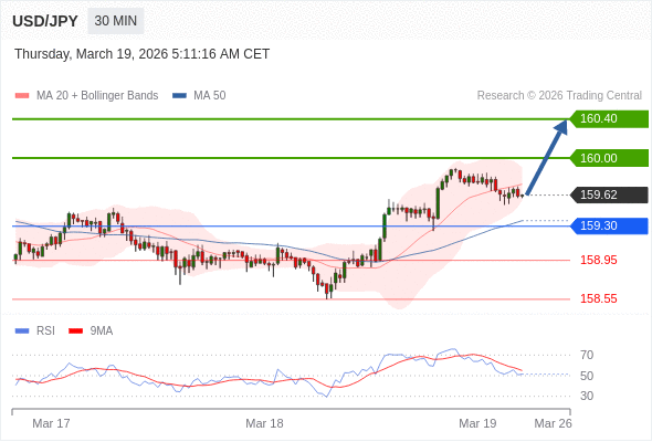 在 159.30 之上,看涨,目标价位为 160.00 ,然后为 160.40 。