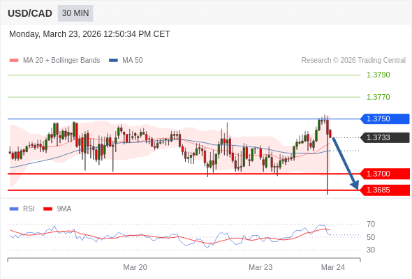 交易策略: 在 1.3750 之下,看跌,目标价位为 1.3700 ,然后为 1.3685 。
