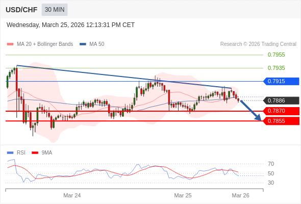 美元/瑞郎 当日内: 存在压力。