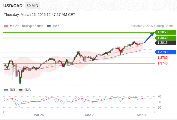 在 1.3780 之上,看涨,目标价位为 1.3830 ,然后为 1.3850 。