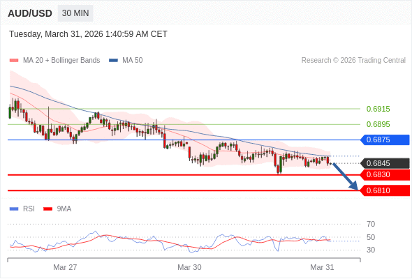 在 0.6875 之下,看跌,目标价位为 0.6830 ,然后为 0.6810 。