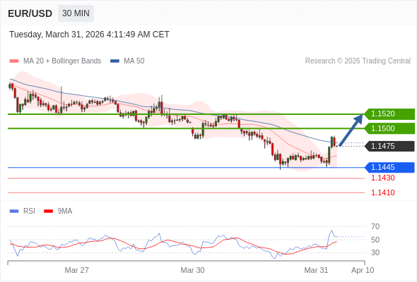 在 1.1445 之上,看涨,目标价位为 1.1500 ,然后为 1.1520 。
