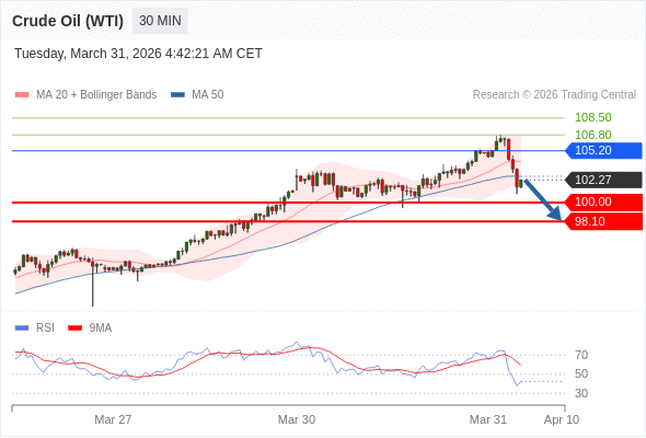 交易策略: 在 105.20 之下,看跌,目标价位为 100.00 ,然后为 98.10 。
