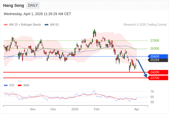 交易策略: 在 25600 之下,看跌,目标价位为 24200 ,然后为 23700 。