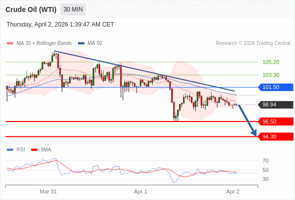 在 101.50 之下,看跌,目标价位为 96.50 ,然后为 94.30 。