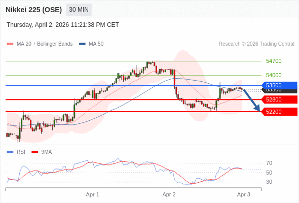 交易策略: 在 53500 之下,看跌,目标价位为 52800 ,然后为 52200 。