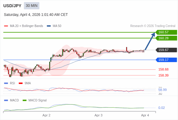 美元/日元 当日内 : 看涨,当 159.17 为支撑位。