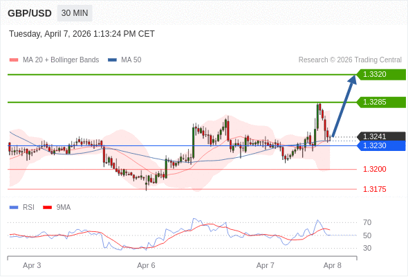 在 1.3230 之上,看涨,目标价位为 1.3285 ,然后为 1.3320 。