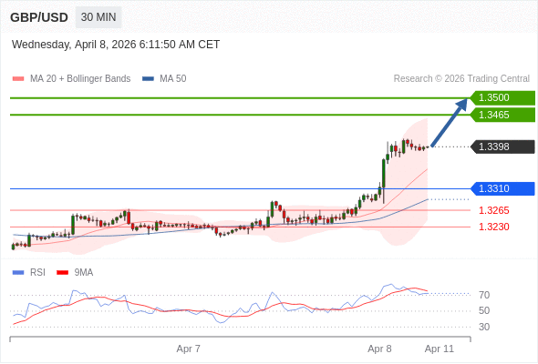 在 1.3310 之上,看涨,目标价位为 1.3465 ,然后为 1.3500 。