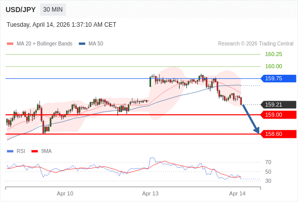 在 159.75 之下,看跌,目标价位为 159.00 ,然后为 158.60 。