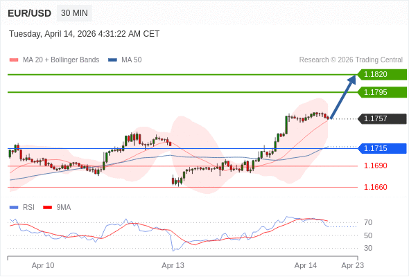 在 1.1715 之上,看涨,目标价位为 1.1795 ,然后为 1.1820 。