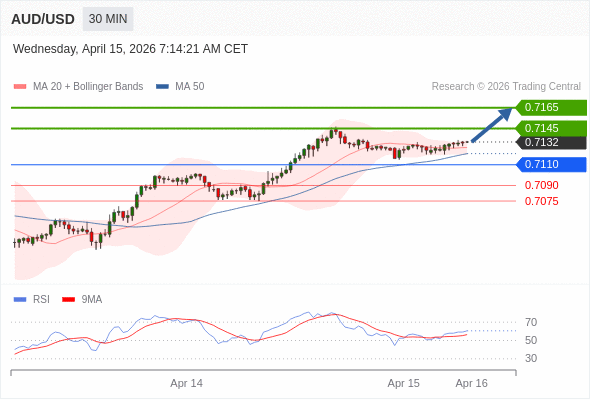 在 0.7110 之上,看涨,目标价位为 0.7145 ,然后为 0.7165 。