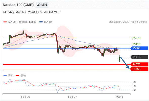 交易策略: 在 25000 之下,看跌,目标价位为 24570 ,然后为 24450 。