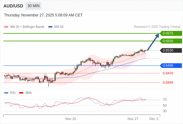 澳元/美元 当日内: 期待0.6555。